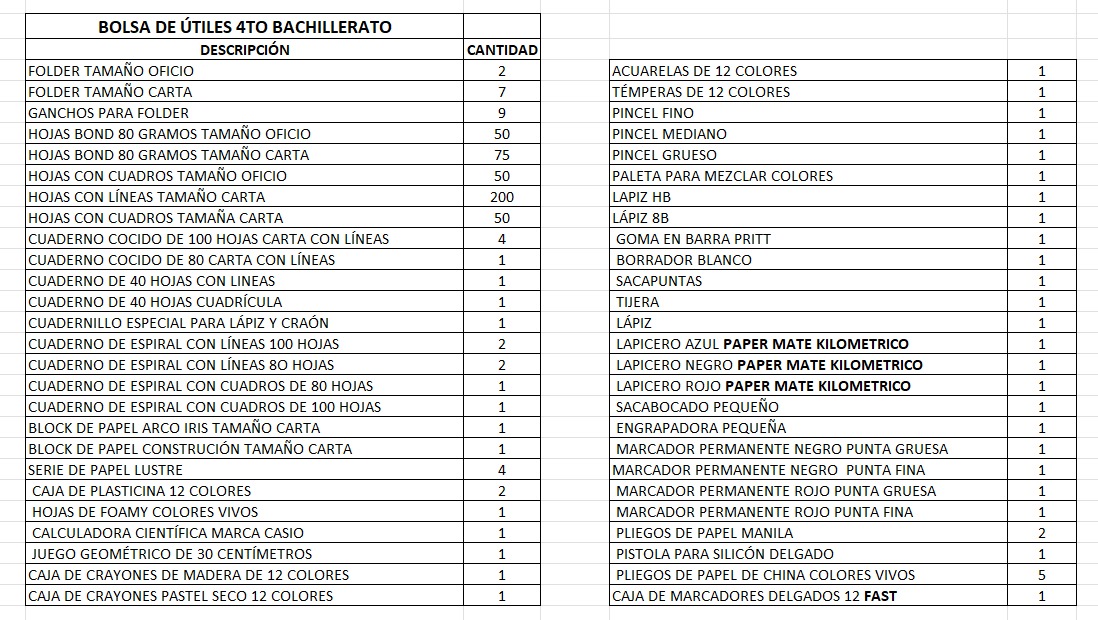 BOLSA DE ÚTILES 4TO BACHILLERATO
